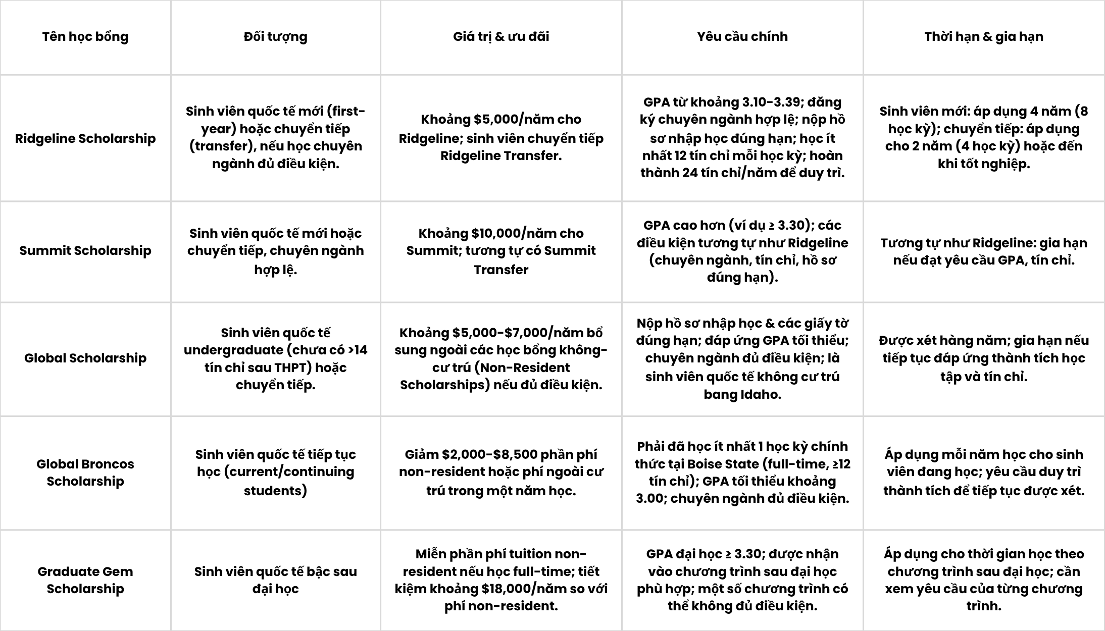 Boise State University cung cấp nhiều loại học bổng giúp giảm chi phí cho sinh viên quốc tế. Học bổng chủ yếu là merit-based (dựa trên thành tích học tập và hồ sơ), một số có tính chất hỗ trợ thêm (ví dụ ngoại trú, phí ngoài cư trú) và có học bổng cho sinh viên học sau đại học. Dưới đây là chi tiết: